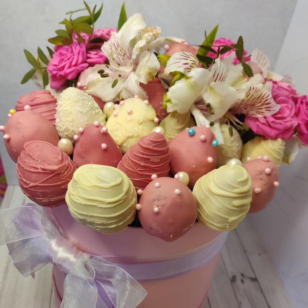 Клубника в шоколаде – 30 шт.рощы кустовые – 3 шт.Альстромерия – 3 шт.фисташка зелень – 2 шт.Коробка шляпная – 1 шт.