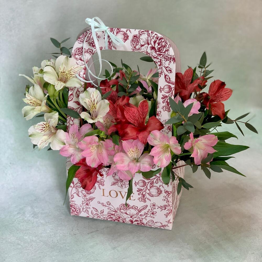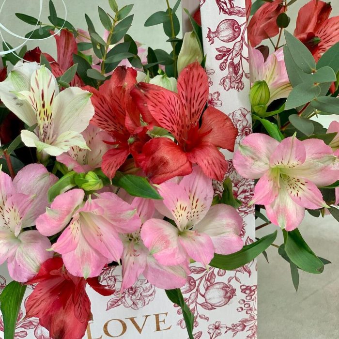 Красная коробка с альстромериями и зеленью