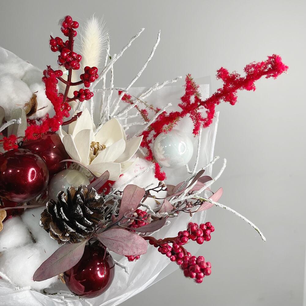 Хлопок – 3 шт.Эвкалипт – 2 шт.Аспарагус – 1 шт.черничник заснеженный – 2 шт.цветы сола – 2 шт.Шишки натуральные – 2 шт.ягодные ветки – 2 шт.Елочные игрушки – 5 шт.Упаковка дизайнерская – 1 шт.