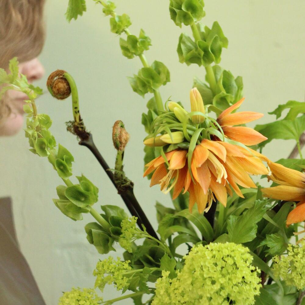 Неординарный букет с рябчиками, ирландскими колокольчиками, корягами, папоротником и вибурнумом.Стильное цветочное решение для любого случая.
