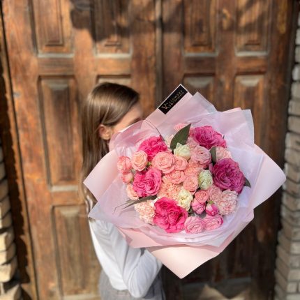 peony spray rose – 7 шт. Lisianthus – 3 шт. gift message card – 1 шт. packaging design – 2 шт. care instruction – 1 шт. free delivery – 1 шт.