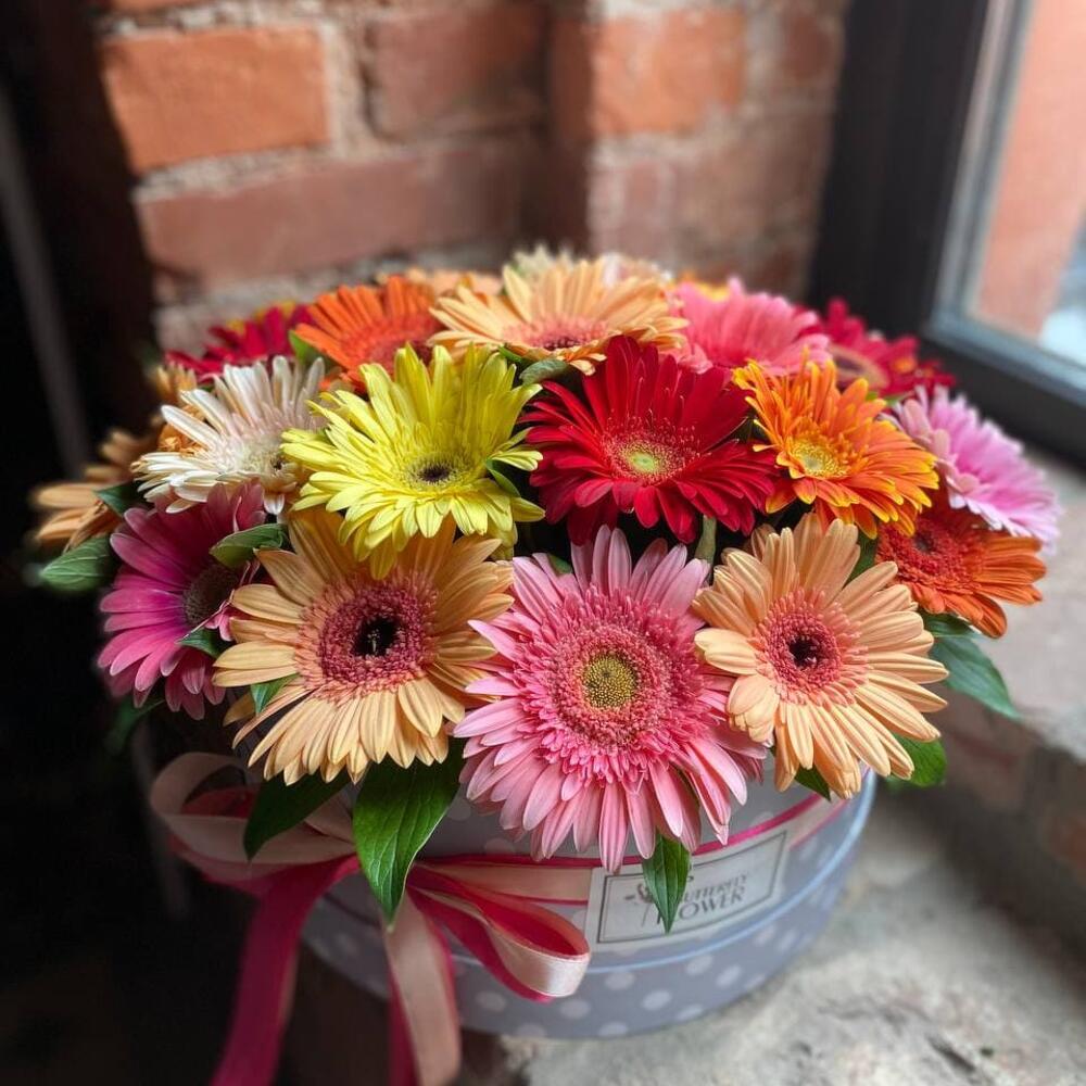Гербера – 25 шт.Оазис – 2 шт.Коробка шляпная – 1 шт.Лента – 1 шт.Салал – 5 шт.