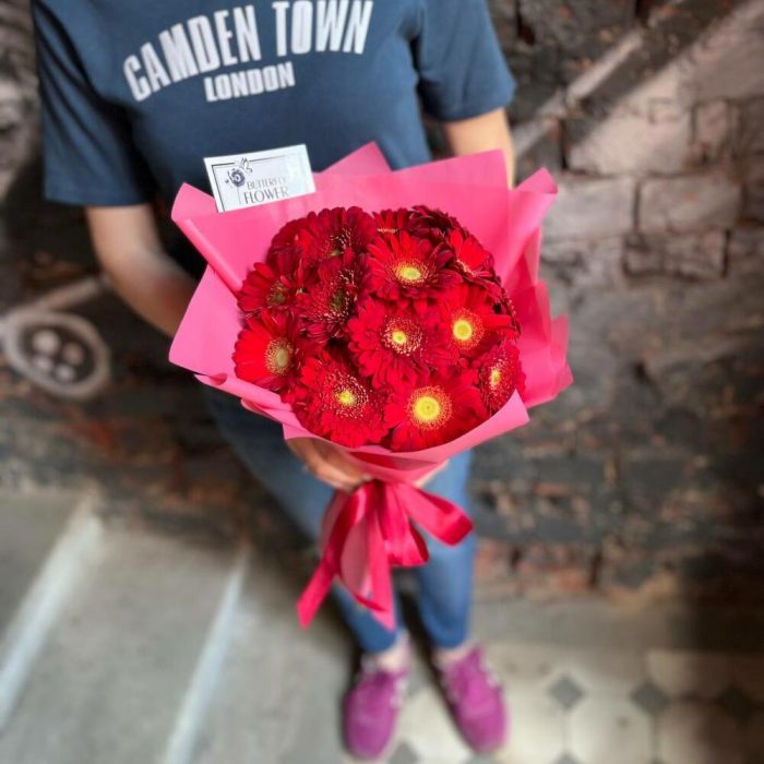 Яркий букет из 15 красных гербер в стильной упаковке “Мадрид”