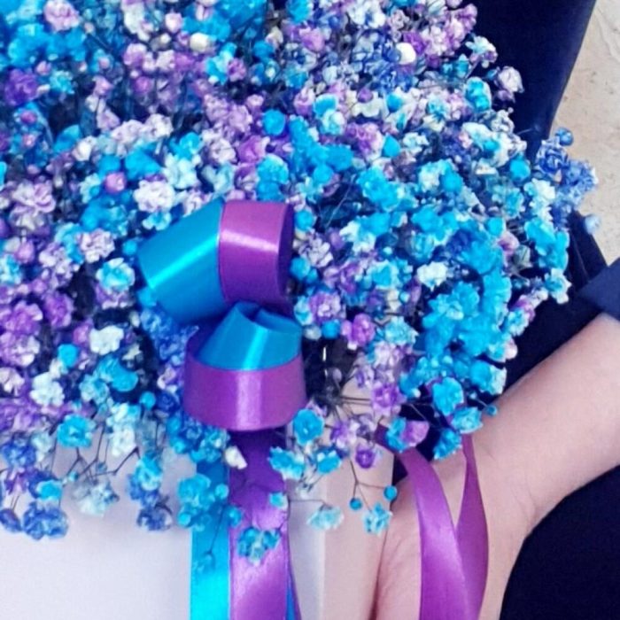 Лента атласная – 2 шт.Топпер сердце – 1 шт.гипсофила радужная – 6 шт.сумочка картонная с ручкой в ассортименте. – 1 шт.