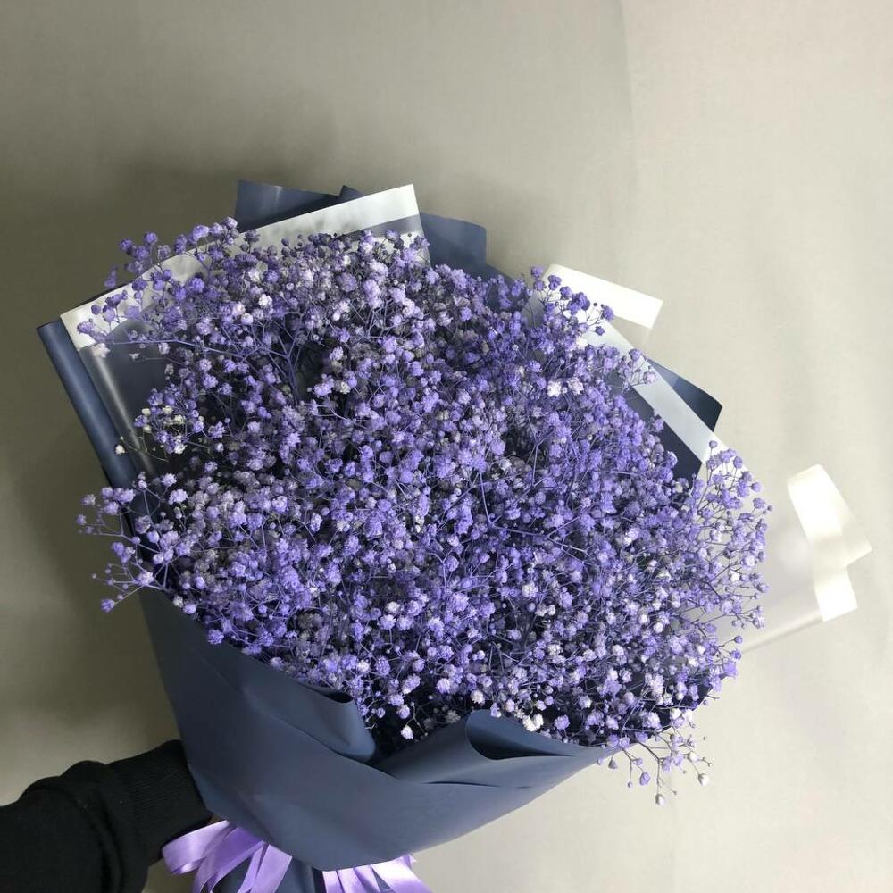 Корейская пленка – 2 шт.Атласная лента – 1 шт.гипсофила окрашенная фиолетовая – 7 шт.