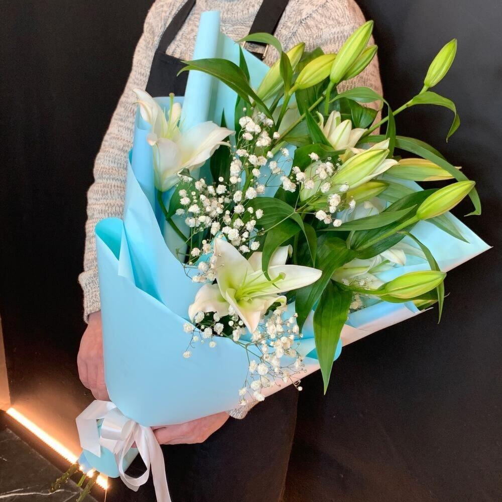 Лилия – 3 шт.Гипсофила – 1 шт.Дизайнерская упаковка – 2 шт.Атласная лента – 1 шт.