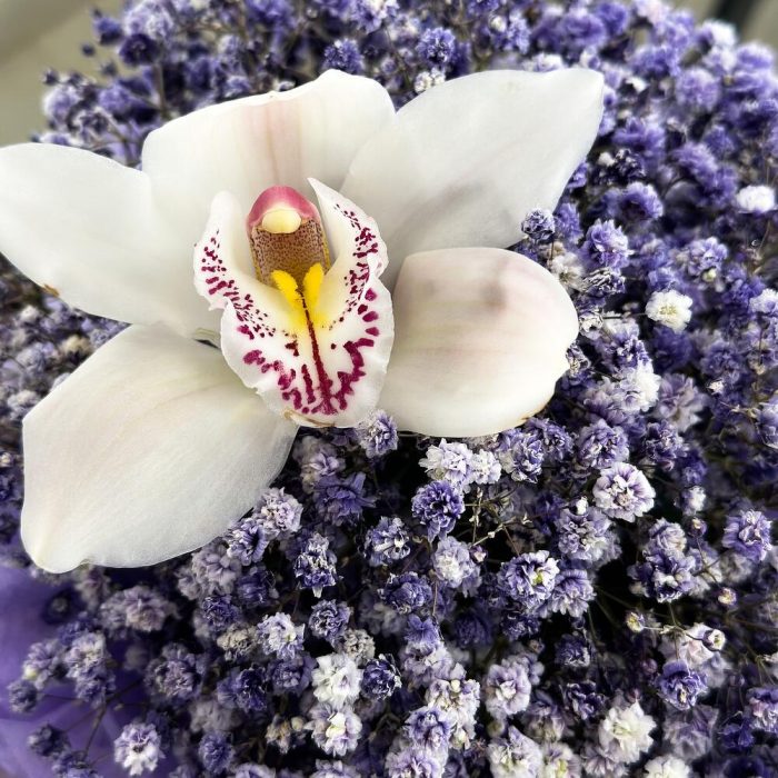 Гипсофила – 7 шт.Орхидея Цимбидиум – 1 шт.Средство для продления жизни цветов – 1 шт.инструкция по уходу за цветами – 1 шт.шляпная коробка с лентами и оазисом – 1 шт.