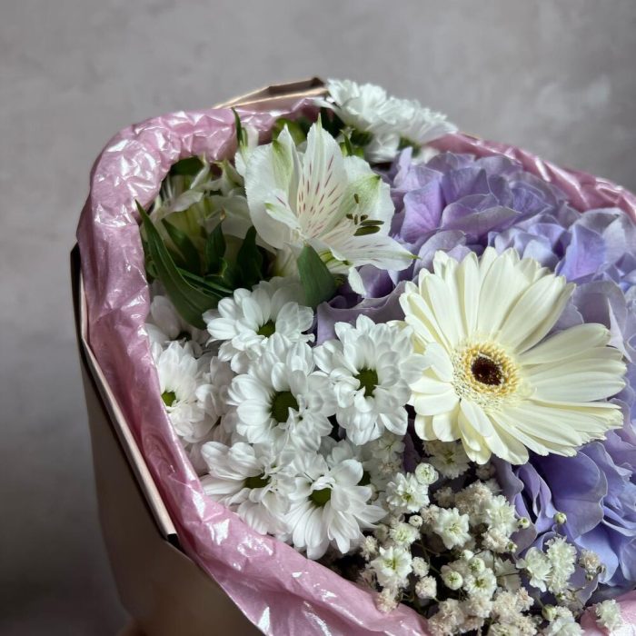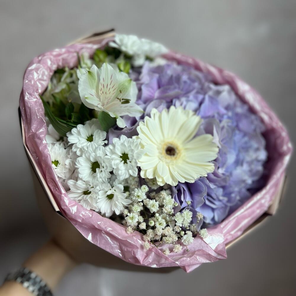 Альстромерия – 1 шт.Сантини – 1 шт.Гипсофила – 1 шт.Гербера – 1 шт.Гортензия – 1 шт.декоративная упаковка – 1 шт.Атласная лента – 1 шт.
