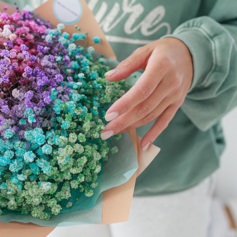 Лента атласная – 1 шт.Упаковка корейская пленка – 2 шт.инструкция по уходу за цветами – 1 шт.упаковка транспортировочная – 1 шт.гипсофила цветная микс – 7 шт.