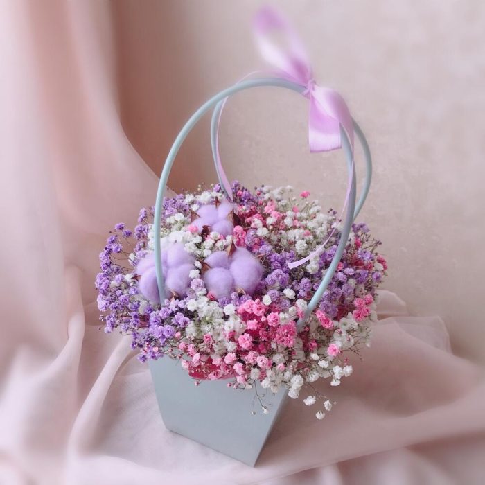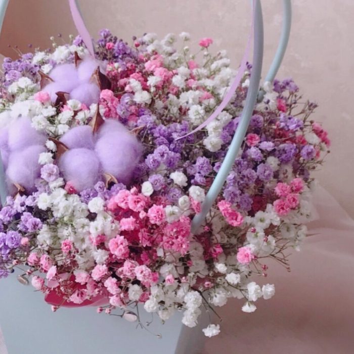 Очаровательная композиция из изысканных свежих цветов.Наполнена множеством соцветий радужной гипсофилы и мягким хлопком. Собрана в стильной сумочке.Композиция из гипсофилы – необычный подарок, который удивит своей невероятной стойкостью, при правильном и простом уходе.❤️ Ставить композицию в прохладном месте, избегая отопительных приборов и прямых солнечных лучей. ❤️ Подливать немного воды в серединку.Гипсофила не вянет, а становится сухоцветом, сохраняя свой вид. Поэтому композиция продолжит радовать ещё очень долго!Чтобы защитить готовый букет во время доставки от любых погодных условий, мы бережно его упаковываем