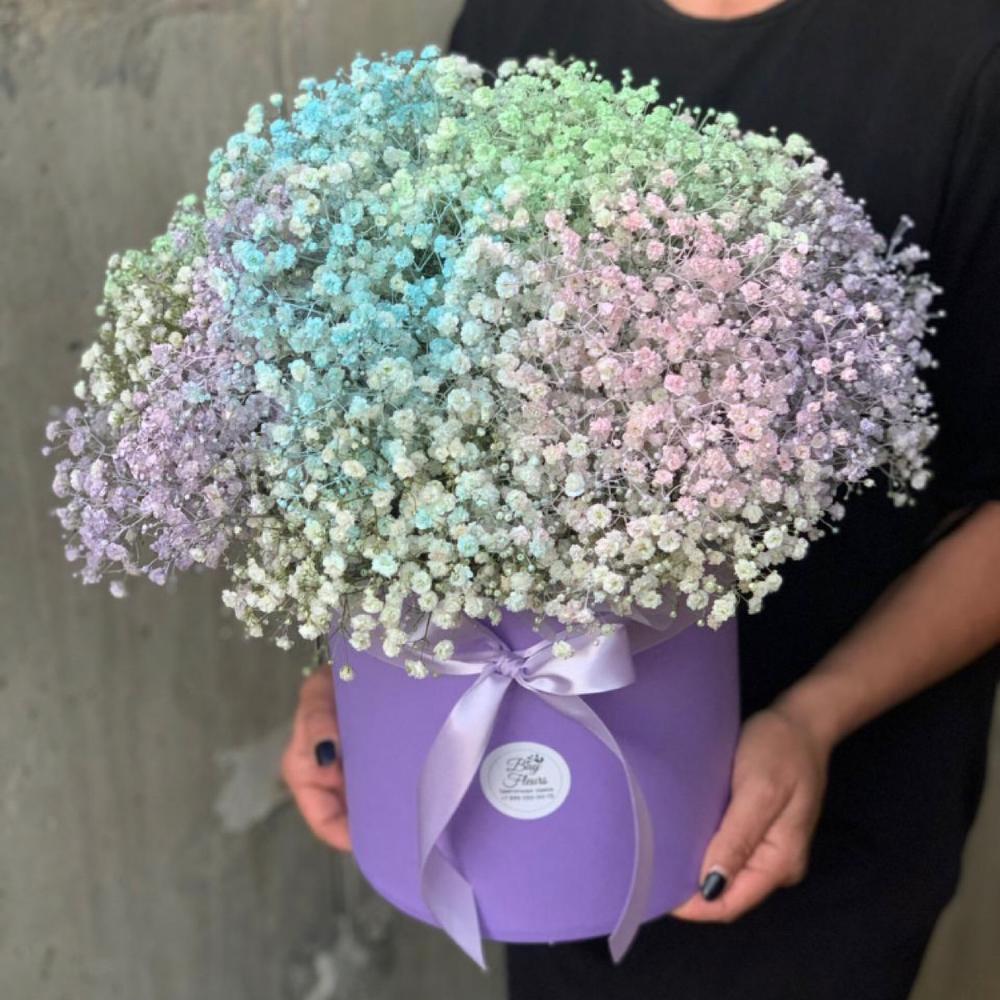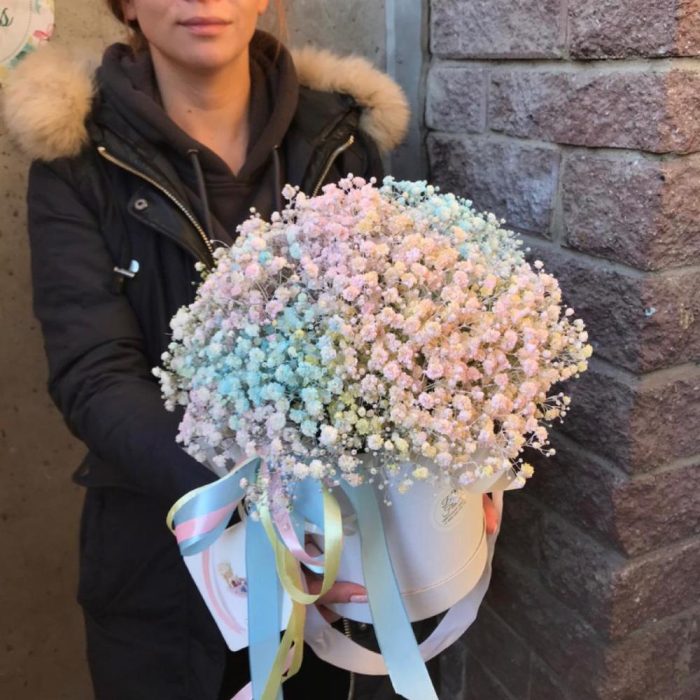 Гипсофила – 9 шт.Шляпная коробка – 1 шт.Оазис флористический – 1 шт.Лента атласная – 3 шт.