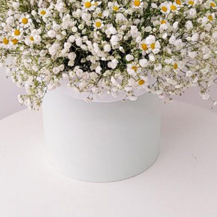 Шляпная коробка с гипсофилой и ромашками