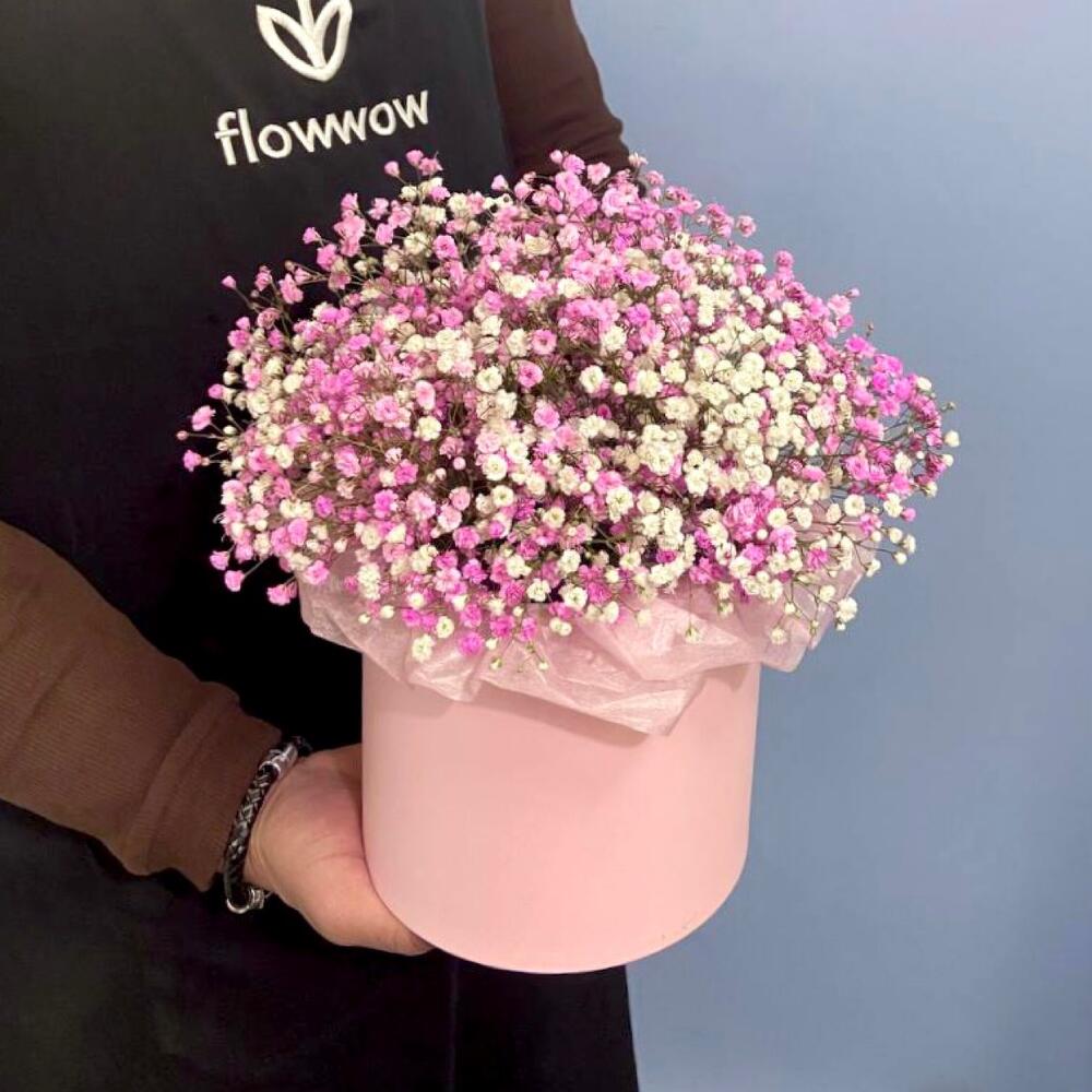 Коробка шляпная – 1 шт.Гипсофила розовая – 6 шт.