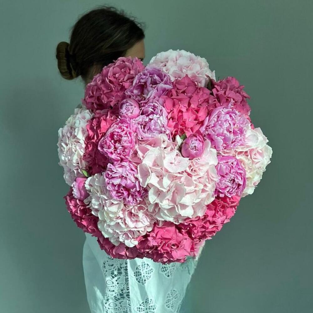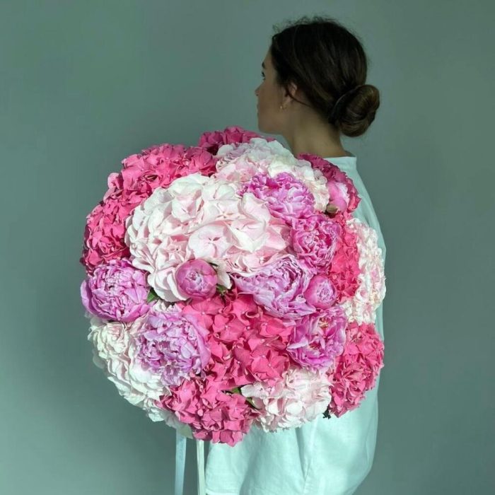 Пион – 9 шт.гортензия ассорти – 14 шт.Упаковка дизайнерская – 1 шт.Лента атласная – 2 шт.Открыточка с вашими пожеланиями – 1 шт.хорошее настроение – 100 шт.инструкция по уходу за цветами – 1 шт.коробка переноска – 1 шт.Кризал – 1 шт.