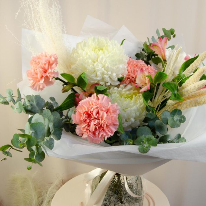 11 нежных гвоздик с эвкалиптом