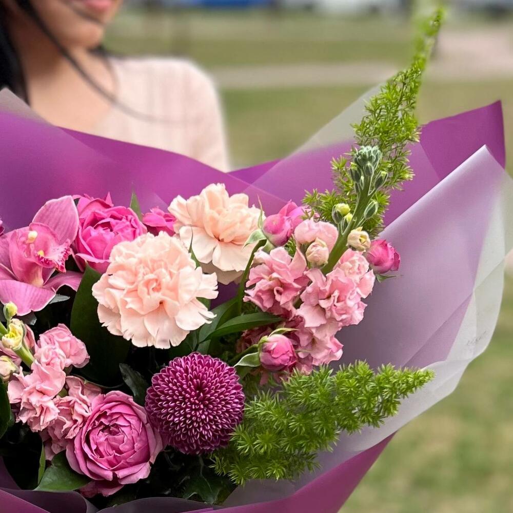 Роза кустовая пионовидная – 1 шт.Роза одноголовая пионовидная – 1 шт.Ранункулюс – 1 шт.Диантус – 1 шт.Хамелациум – 1 шт.Альстромерия – 1 шт.Эустома – 1 шт.Маттиола – 1 шт.Зелень – 1 шт.