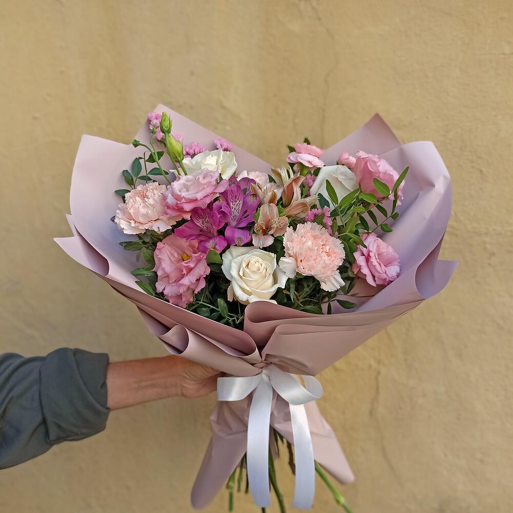 Фисташка – 3 шт.Диантус – 3 шт.Роза – 3 шт.Статица – 1 шт.Лимониум – 1 шт.Альстромерия – 2 шт.Лизиантус – 1 шт.