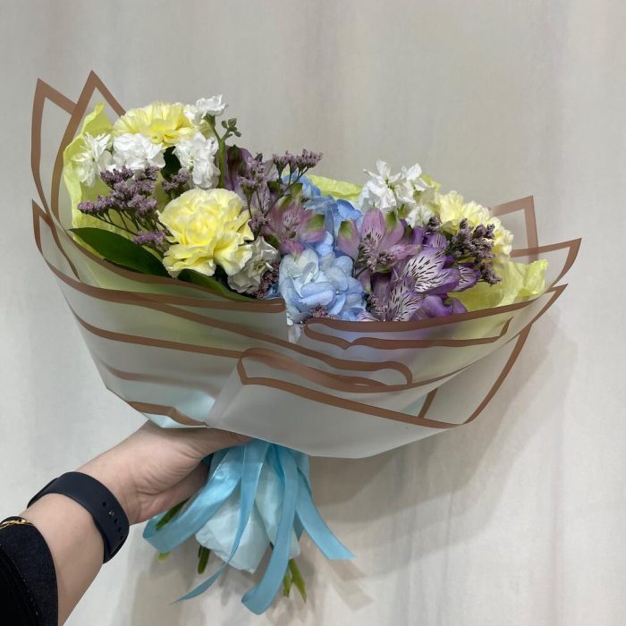 Гортензия голубая – 1 шт.Маттиола – 2 шт.Диантус – 3 шт.алсьтрамерия – 2 шт.Лимониум – 1 шт.