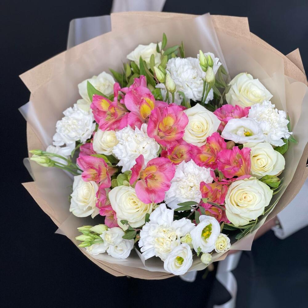 Категории: АльстромерииРозы, Гвоздики, Лизиантусы