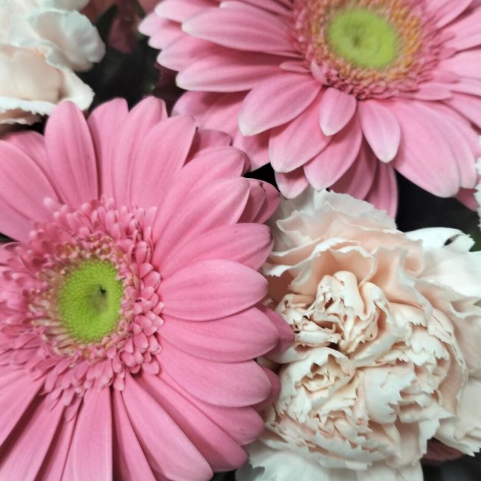 Упаковка – 2 шт.Лента атласная – 1 шт.Гвоздика сортовая – 4 шт.Альстромерия Микс Европа – 3 шт.гербера стандарт – 5 шт.