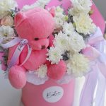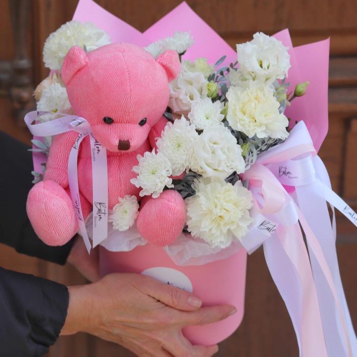 Нежная, чувственная и воздушная композиция с мишкой, выполненная из стокйих цветов: лизиантуса, сантини и диантусов.Такая композиция точно понравится яркой и энергичной получательнице, и будет долго радовать её.К композиции прилагается открытка с вашими пожеланиями и приятный комплимент от нашего магазина – шоколадка.Мы также будем рады отправить вместе с композицией конфеты, шоколад ручной работы или б/а вино по вашим пожеланиям, просто напишите нам в личные сообщения. Заказывая нашу композицию, Вы всегда получите исключительный сервис и заботу о клиенте