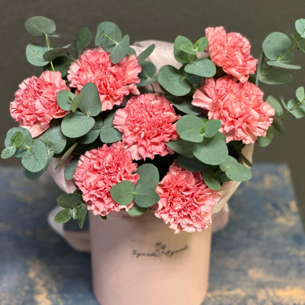 Эвкалипт – 1 шт.Тишью – 1 шт.Диантус – 7 шт.Коробка шляпная – 1 шт.Оазис флористический – 1 шт.