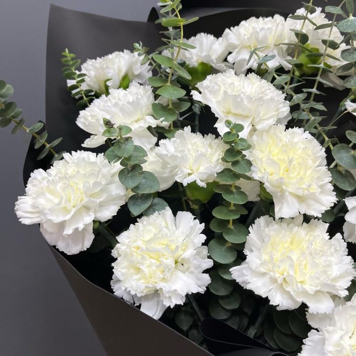 Малефисента креативный премиум монобукет из 19 белоснежных диантусов с эвкалиптом