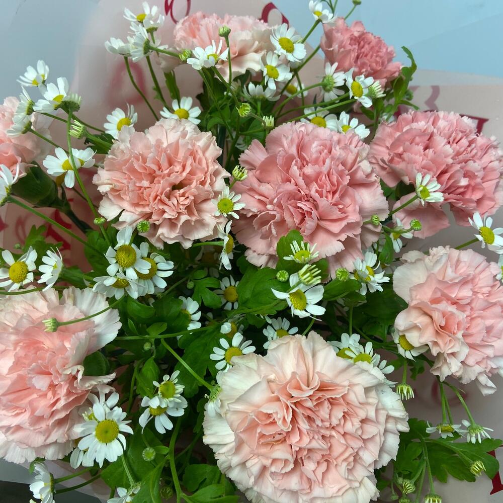 Лента – 1 шт.Матрикария – 8 шт.Диантус розовый – 9 шт.Упаковка матовая пленка – 1 шт.