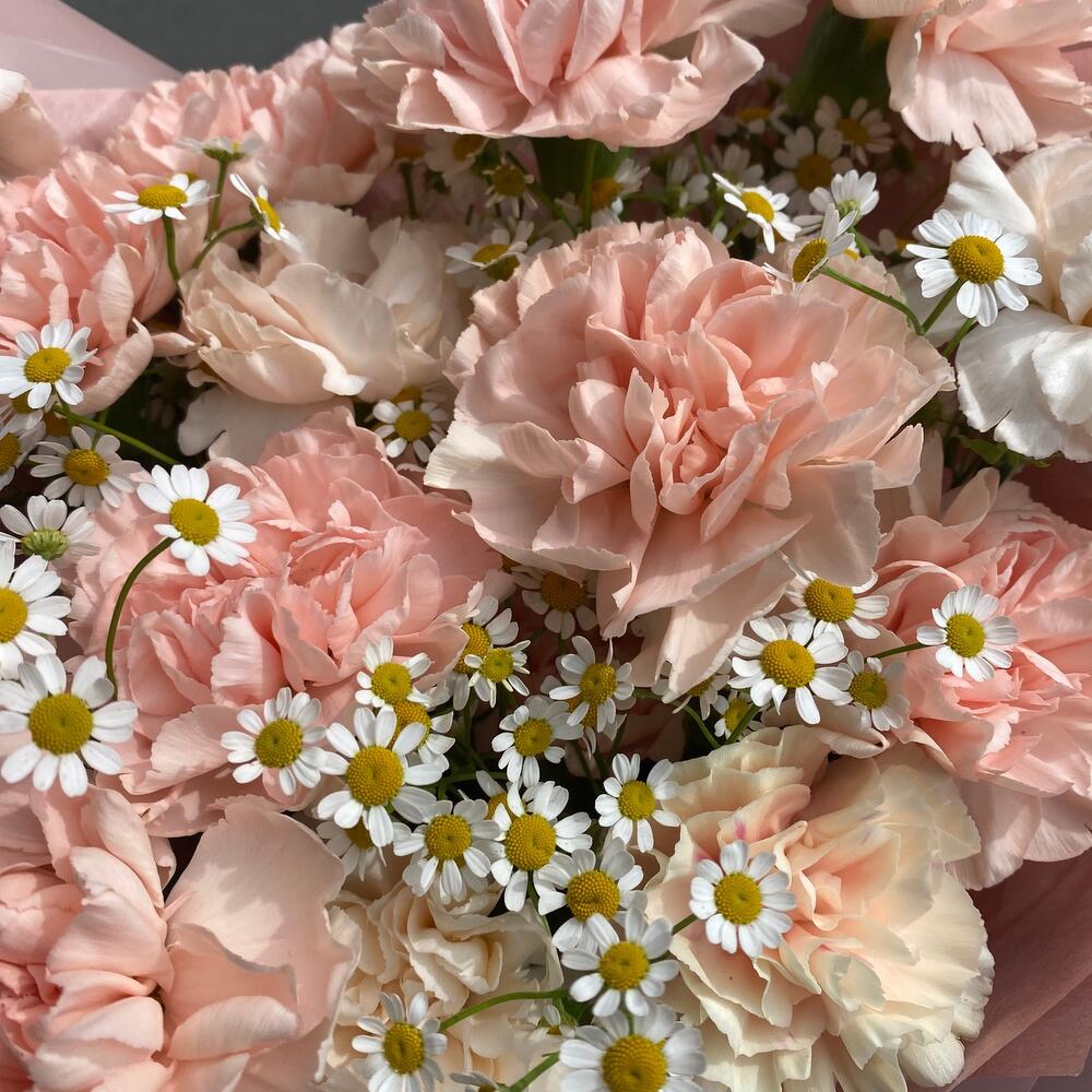 Она любит букеты, которые долго стоят(ромашки+гвоздика)