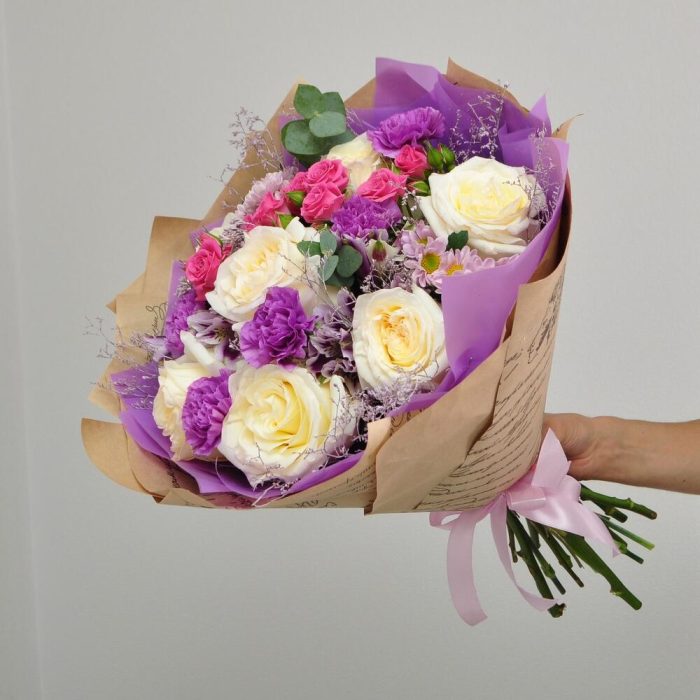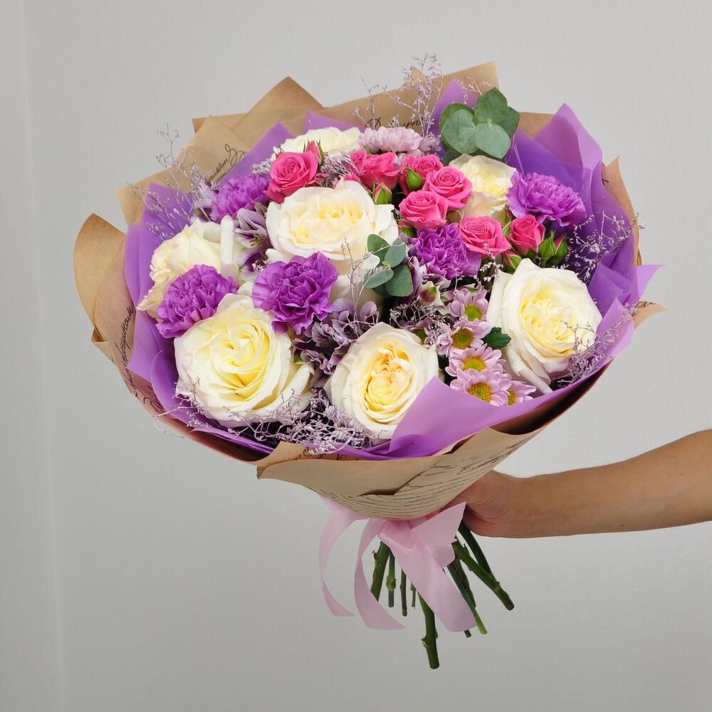 Альстромерия – 2 шт.Роза кустовая – 1 шт.Эвкалипт – 1 шт.Лента атласная – 1 шт.Диантус – 5 шт.Сантини – 2 шт.Крафт – 1 шт.Роза белая пионовидная – 7 шт.Кермек – 1 шт.Пленка матовая – 1 шт.
