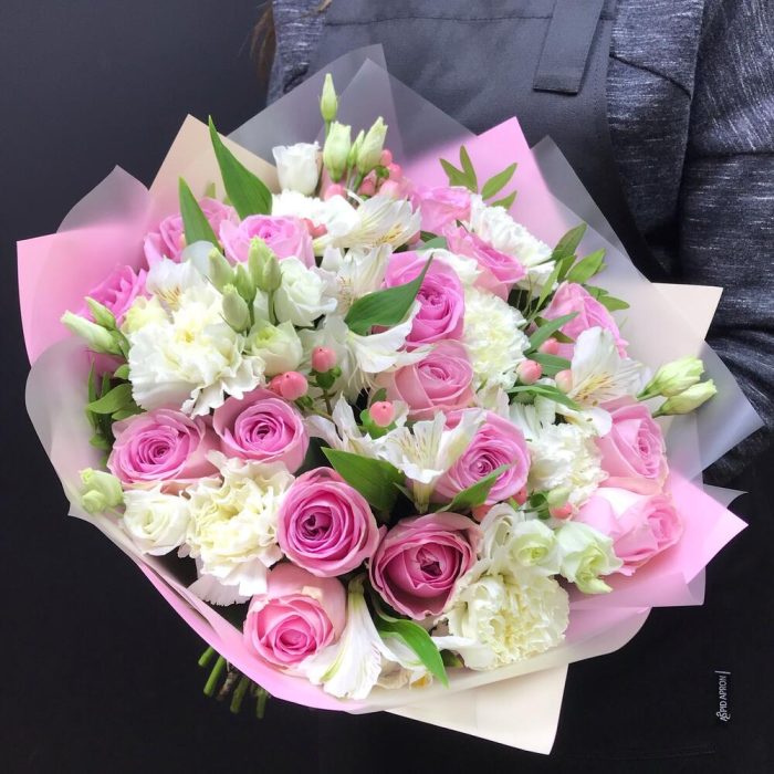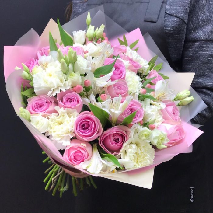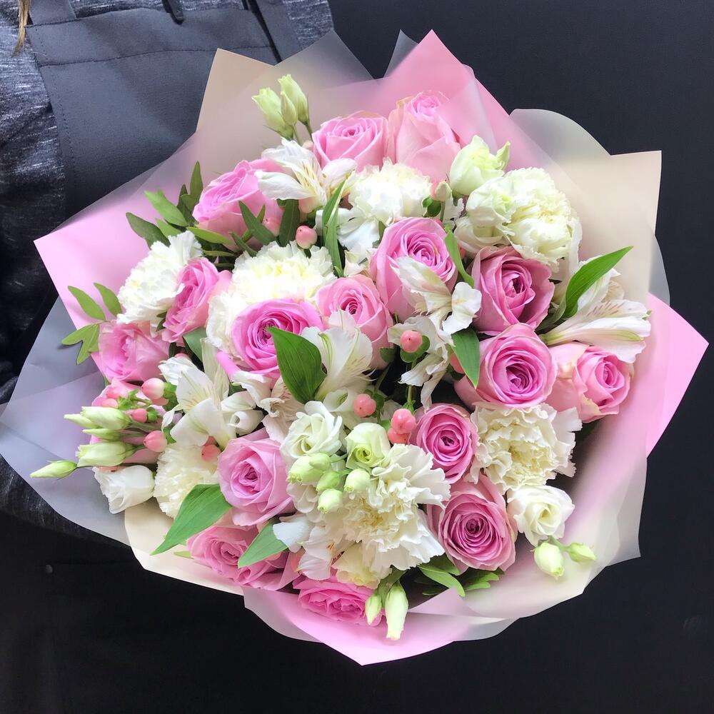 Альстромерии, Гвоздики, Кустовые розы, Лизиантусы, Розы, Хризантемы