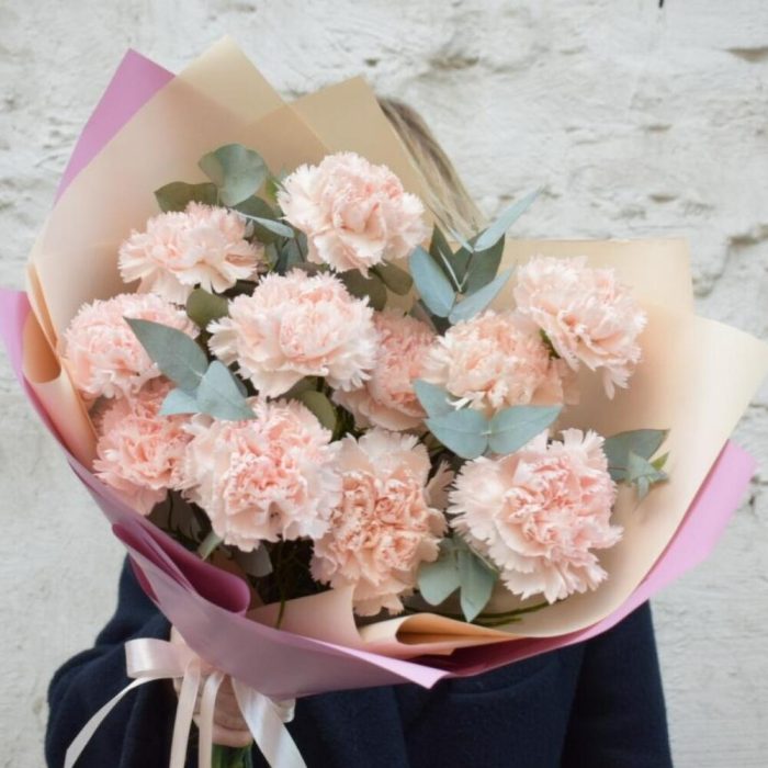 11 нежно-розовых диантусов с эвкалиптом