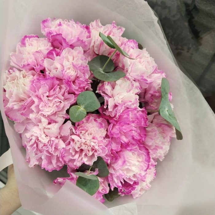 Букет из крашеной гвоздики с добавлением веточек эвкалипта в лаконичной матовой упаковке