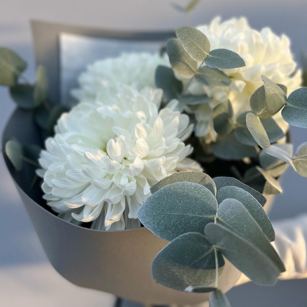 Хризантема Антонов – 3 шт.Эвкалипт – 3 шт.Тишью – 1 шт.Фоамиран (упаковка) – 1 шт.Лента атласная – 1 шт.