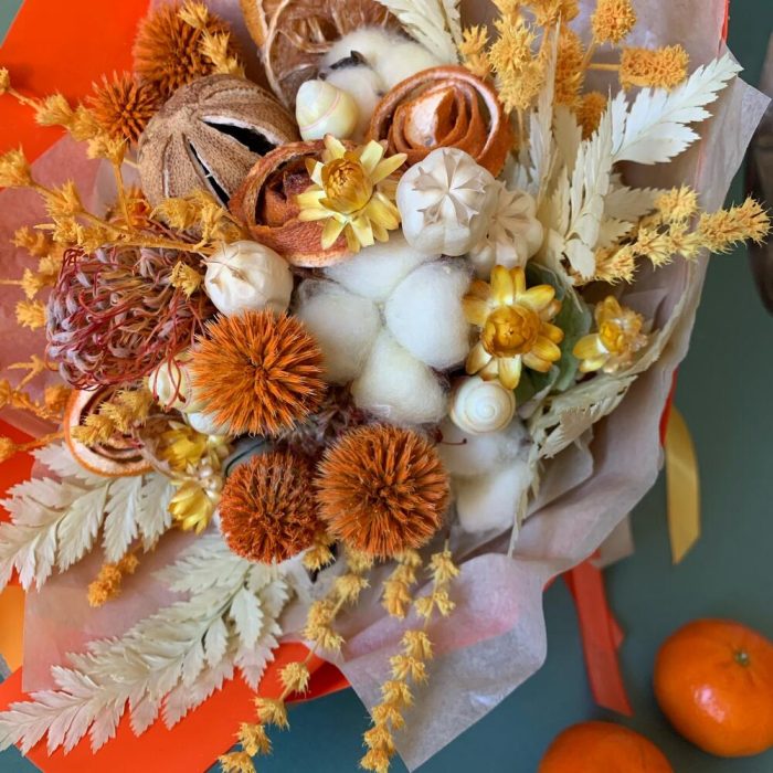 Хлопок (сухоцвет) – 5 шт.Апельсин – 1 шт.апельсиновые дольки – 5 шт.эхинопсис – 5 шт.Нигелла сухоцвет – 3 шт.ракушки лимонные – 5 шт.Гелихризум – 6 шт.папоротник стабилизированный – 1 шт.шандра стабилизированная – 3 шт.нутан сухоцвет – 2 шт.гортензия сухоцвет – 1 шт.Тишью – 1 шт.Пленка матовая – 1 шт.