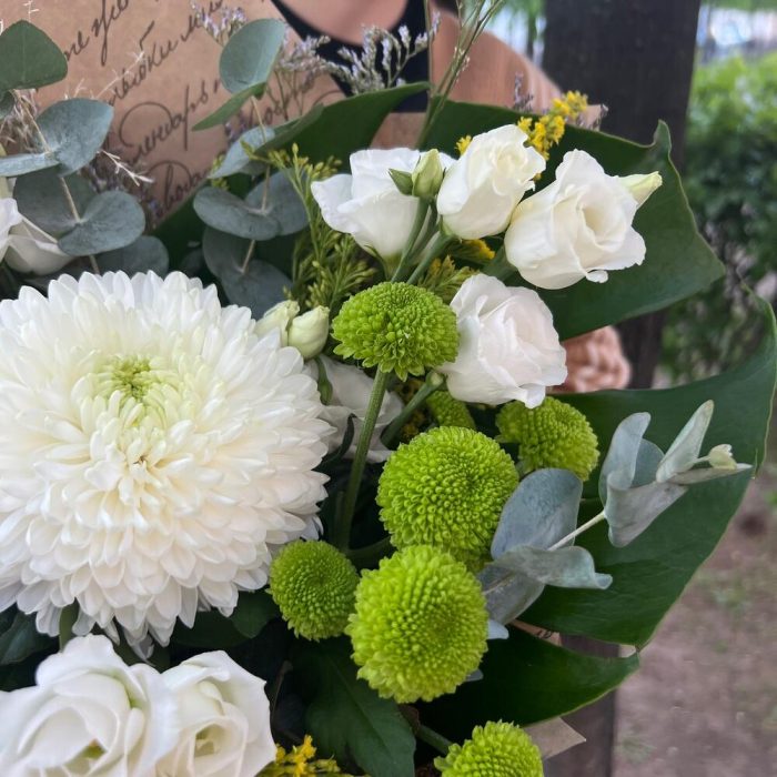 Хризантема – 1 шт.Хризантема кустовая – 2 шт.Солидаго – 2 шт.Лизиантус – 2 шт.Эвкалипт – 1 шт.Зелень – 1 шт.Лимониум – 1 шт.Сухоцвет – 1 шт.Упаковка дизайнерская – 1 шт.