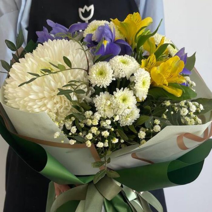 Альстромерия – 1 шт.Гипсофила – 1 шт.Ирис – 3 шт.Тишью – 2 шт.Хризантема одноголовая – 1 шт.Сантини микс – 2 шт.Пленка матовая – 4 шт.бант атласный – 2 шт.фисшатка – 3 шт.