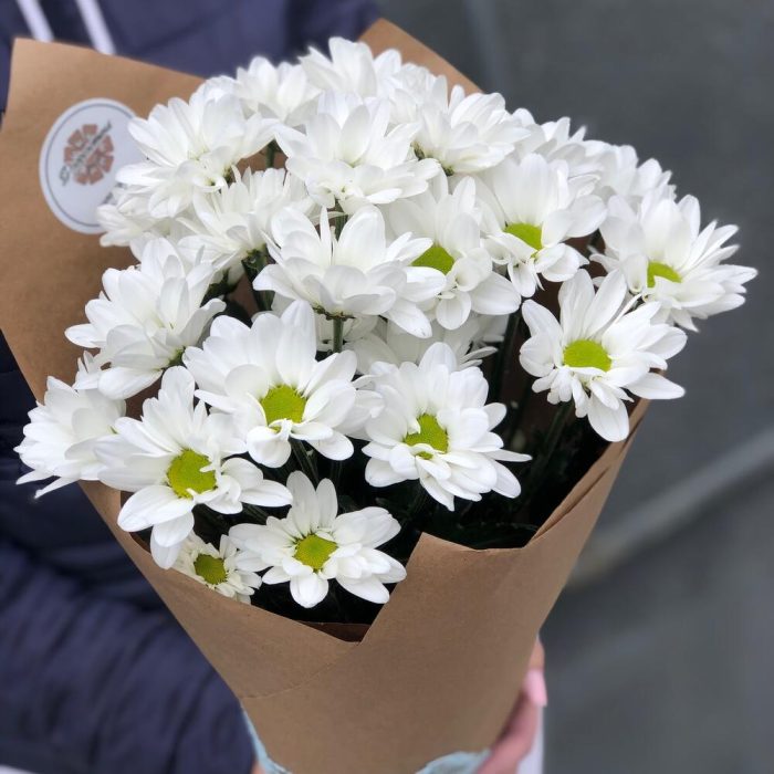 Хризантема кустовая – 3 шт.Лента атласная – 3 шт.Крафт дизайнерский – 2 шт.