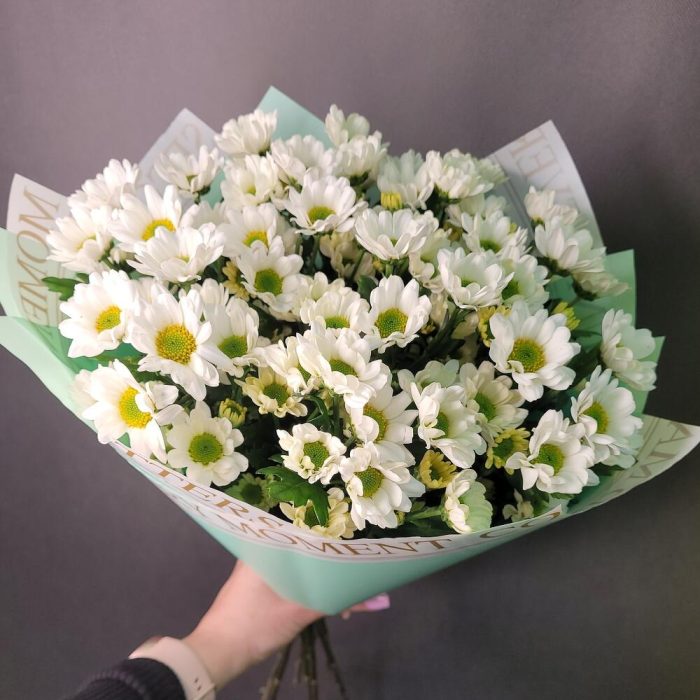 Лента атласная – 1 шт.Упаковка дизайнерская – 1 шт.Хризантема кустовая Сантини – 9 шт.