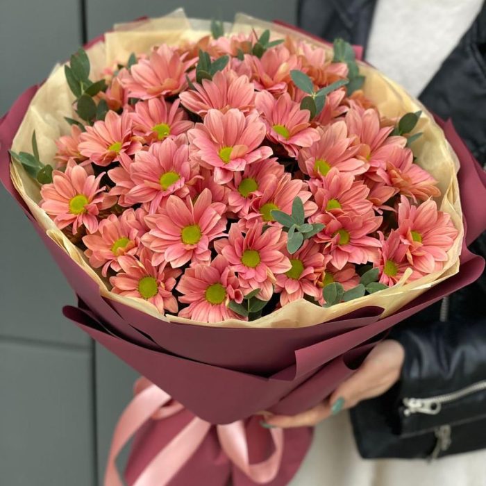 Букет из ромашковой персиковой хризантемы и эвкалипта в оформлении!
