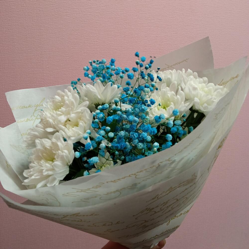 Гипсофила – 2 шт.Лента – 1 шт.Хризантема кустовая – 3 шт.Упаковка – 1 шт.
