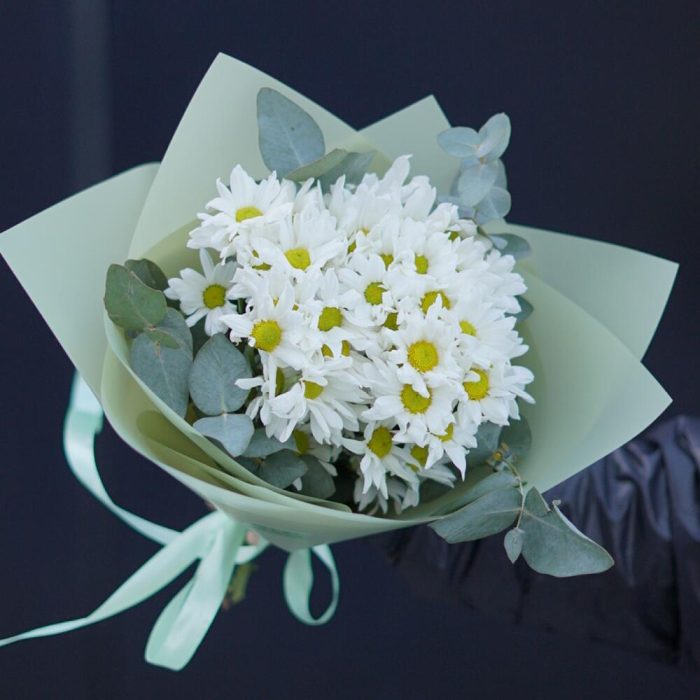 Хризантема кустовая – 9 шт. Эвкалипт – 5 шт. Упаковка дизайнерская – 2 шт. Открыточка с вашими пожеланиями – 1 шт. инструкция по уходу за цветами – 1 шт.