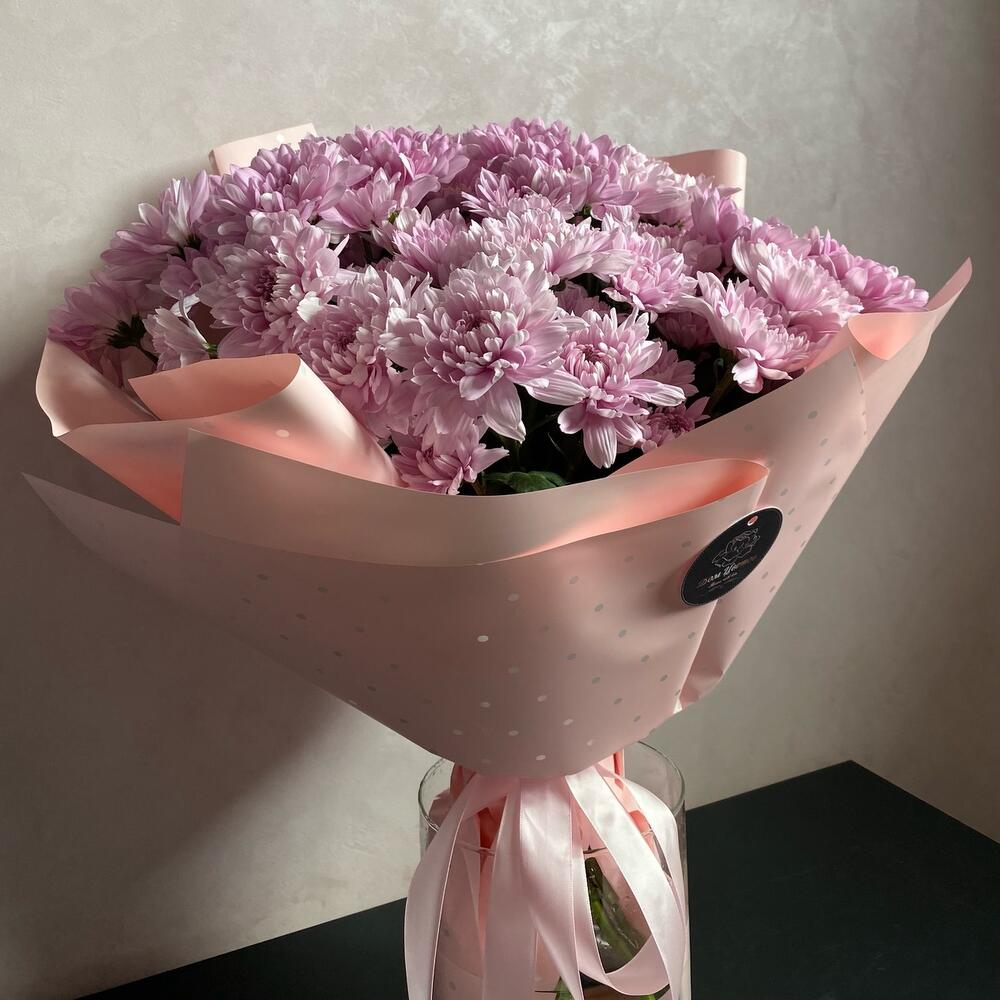 Кустовая хризантема – 13 шт.Дизайнерская упаковка – 1 шт.Атласная лента – 1 шт.открытка с правилами ухода за свежими цветами – 1 шт.Транспортировочная коробка – 1 шт.