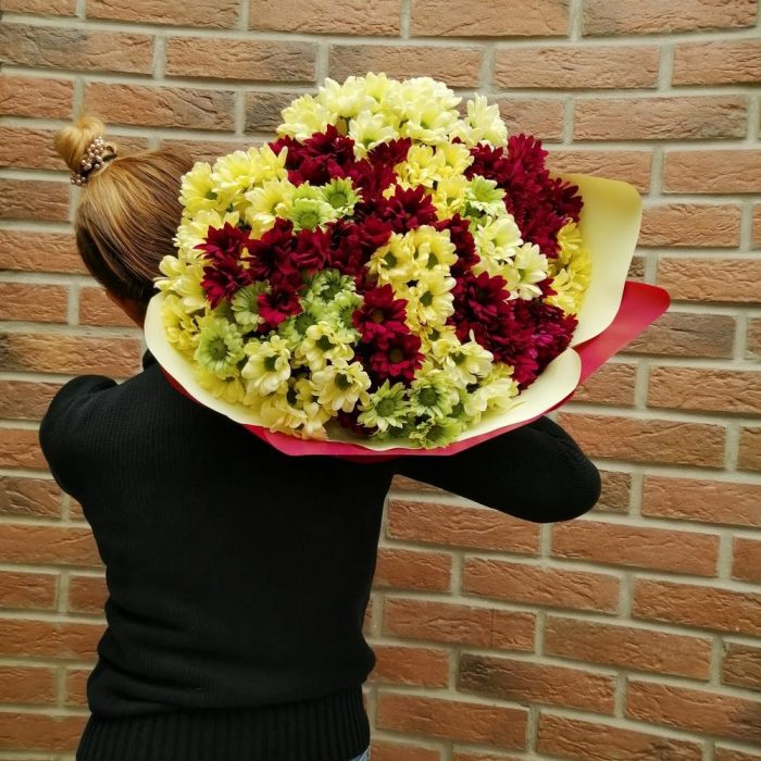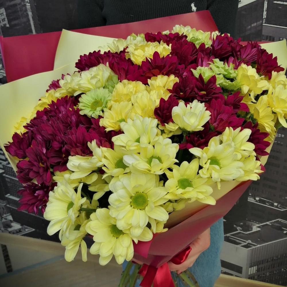 Лента – 1 шт.Упаковка дизайнерская – 1 шт.Хризантема кустовая микс – 25 шт.
