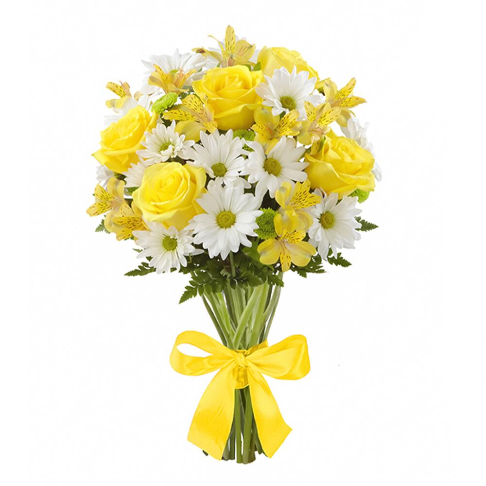 Папоротник – 1 шт.хризантема кустовая (белый) – 3 шт.альстромерия (желтый) – 3 шт.лента атласная (желтый) – 1 шт.