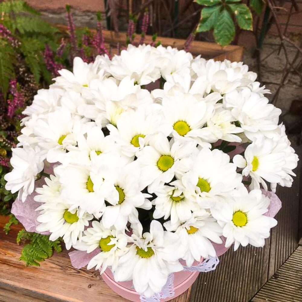 Шляпная коробка – 1 шт.Оазис – 1 шт.Хризантема кустовая – 5 шт.Лента – 1 шт.