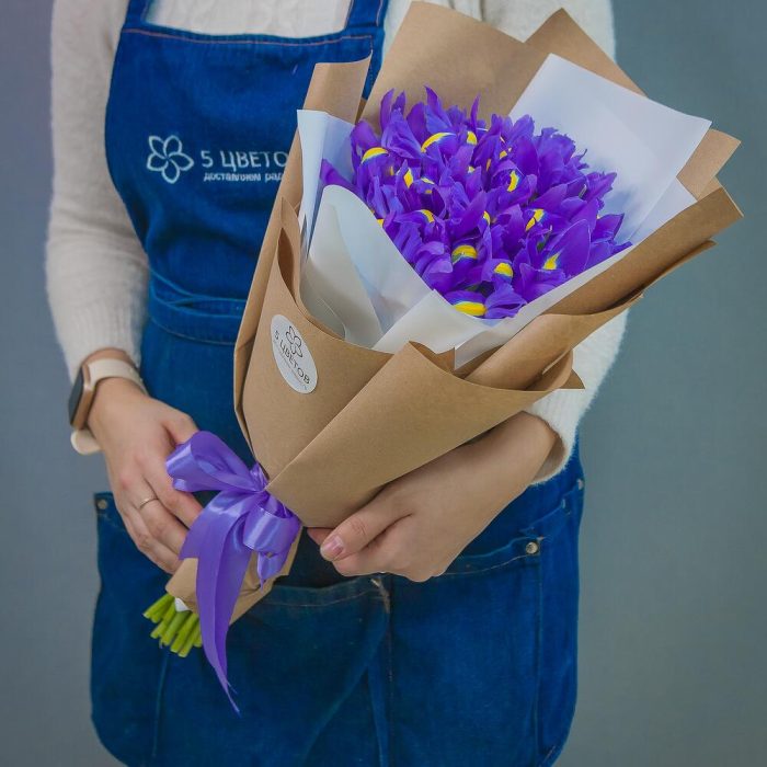 ирисы синие – 19 шт.Упаковка крафт – 1 шт.Атласная лента – 1 шт.