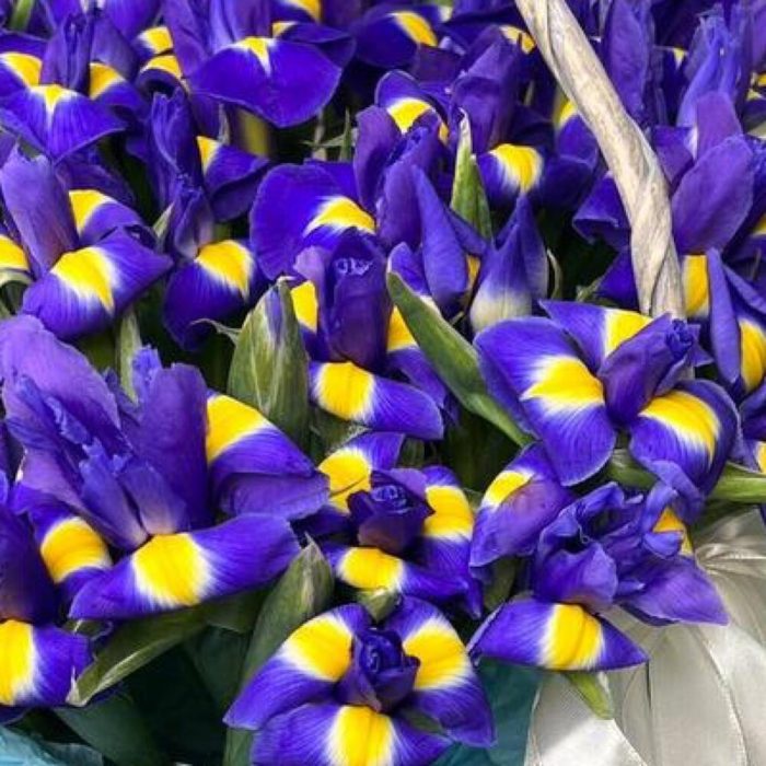 Ирис синий – 51 шт.Корзина плетеная – 1 шт.Упаковка дизайнерская – 1 шт.Лента атласная – 2 шт.Открыточка с вашими пожеланиями – 1 шт.хорошее настроение – 100 шт.инструкция по уходу за цветами – 1 шт.Кризал – 1 шт.