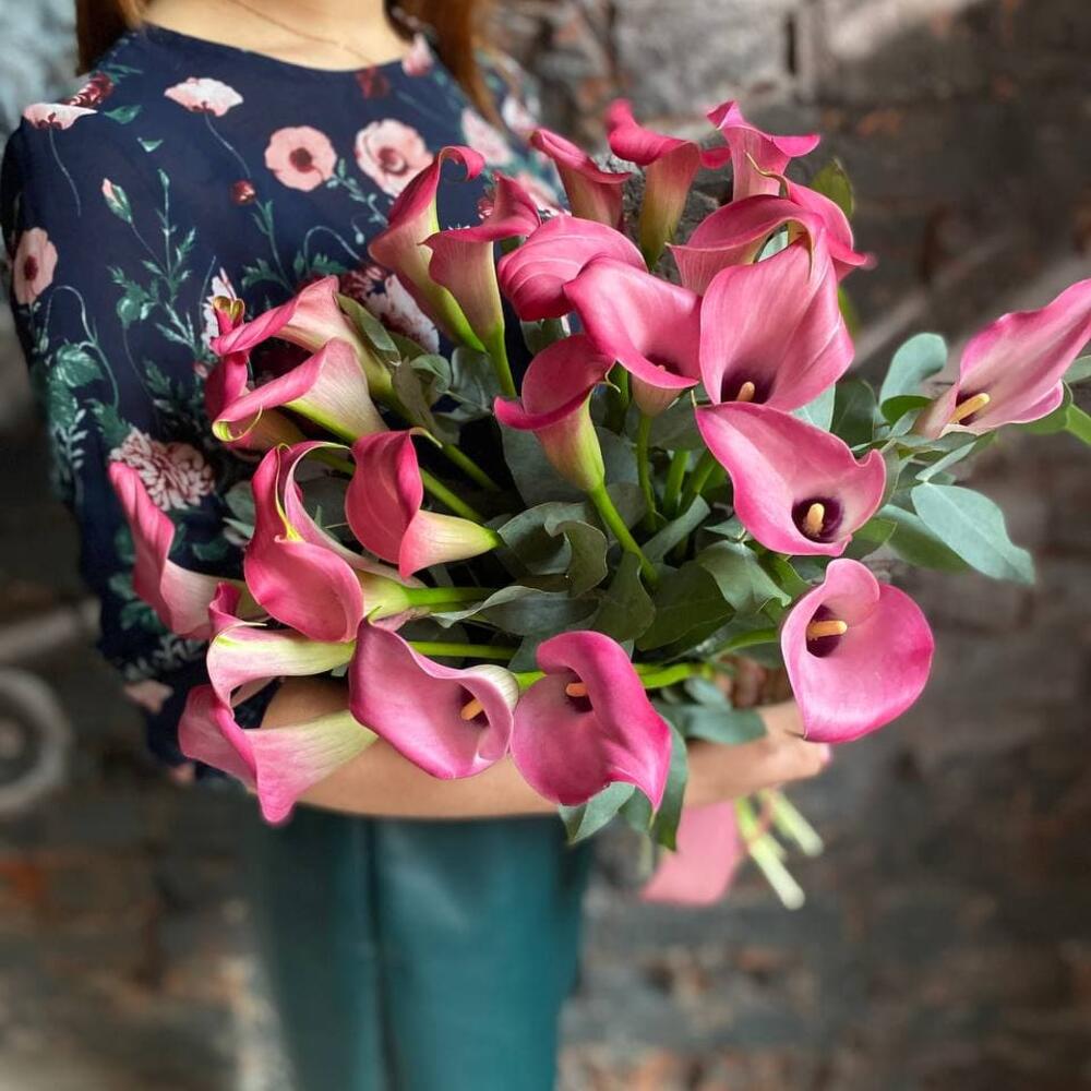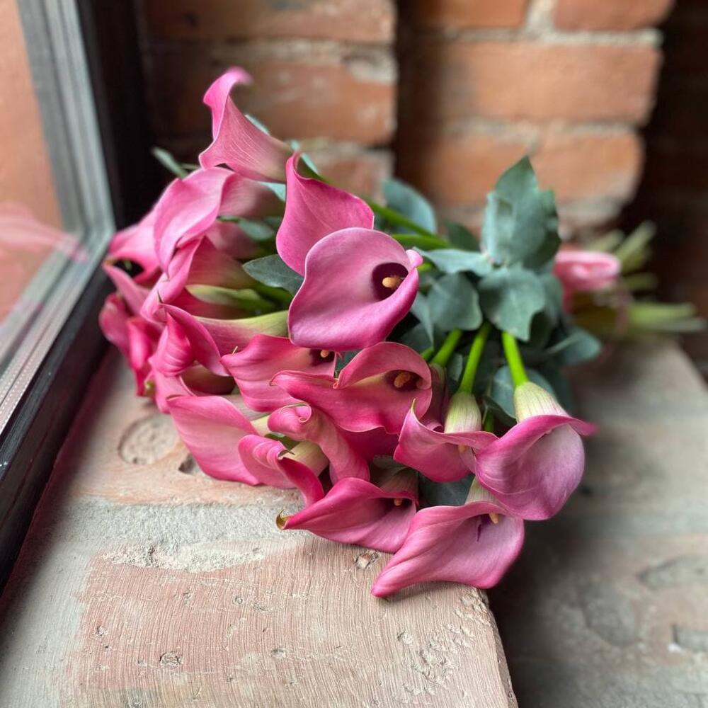 Букет из 25 розовых калл с эвкалиптом