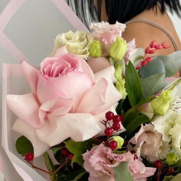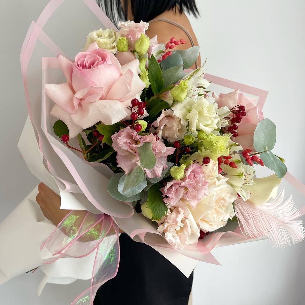 Альстромерия – 4 шт.Гиперикум – 1 шт.Роза Эквадор – 2 шт.Эустома – 3 шт.Лента атласная – 2 шт.Роза пионовидная – 1 шт.Кустовая пионовидная роза – 2 шт.Пленка матовая – 6 шт.зелень декоративная – 4 шт.перо декоративное – 1 шт.
